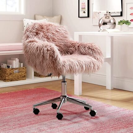 DKLGG Faux Fur Desk Chair, Cute Fluffy Upholstered Padded Seat, Vanity Accent Modern Height Adjustable Swivel Arm Decorative Furniture for Living Room/Makeup/Home Office/Teen Girls Bedroom, Pink