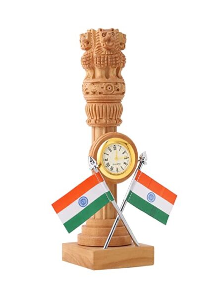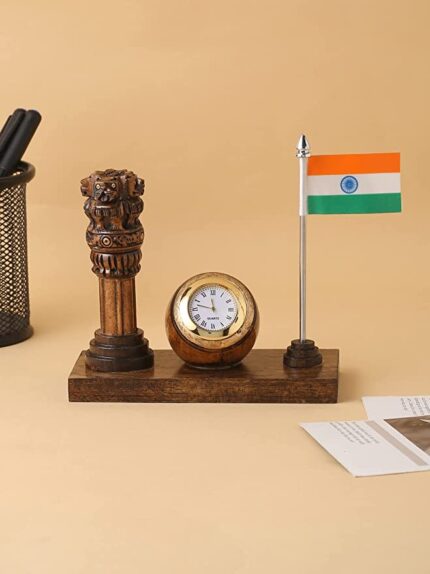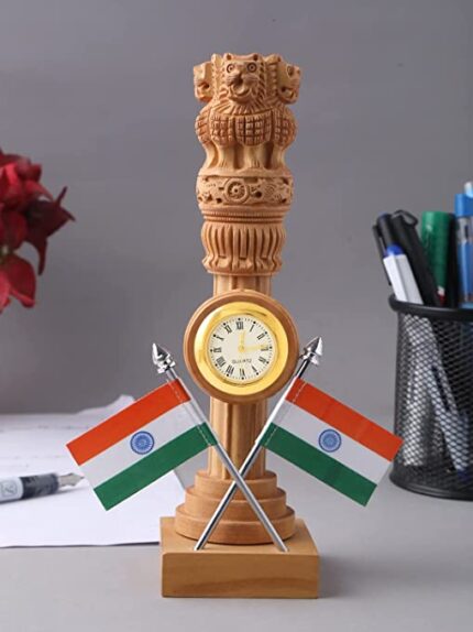 RDK Antique Designed Wooden Carved Ashok Stambh Pillar with 2 Flags & Clock II Indian National Emblem Table Showpiece Figurine for Home and Office II Receptions/Desk II Gifting I Desk Organizer