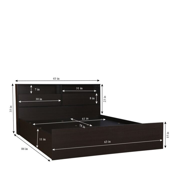 Specification GeneralRich in dark walnut, the Alex king bed with box storage is crafted from environment friendly engineered wood in classic-modern styleIt celebrates simplicity and functionality with clean lines in its form and a storage-friendly headboardMaterial- The material is particle board with PU finish This Product is made with environment friendly European standard E2 grade Particle board, suitable for indoor furniture usagePanels are laminated with PU finish & edegbanded on all exposed surfaces to protect from moistureThis product is termite resistant & borer proofFinish- Natural wood grain finish gives an elegant lookConstruction- The headboard storage shelves can accommodate books, mobile, charger, medicines, water bottles etcThe bed has box storage, covered with panels which can be easily removed to access storage areaFor ease of lifting, cut-out holes are provided which are fitted with plastic caps for safetyThe mattress is rested on engineered wood panels, that offer a flat and sturdy surface to the mattressBase panels are attached with buffers at the bottomThis keeps the base panels slightly raised above the ground, hence protecting from water, dust etcfrom floorBase Panels are removable which makes it easier to clean the floorStorage- Vertical Partitions in the box bed, provide separate compartments and double up as load bearing members