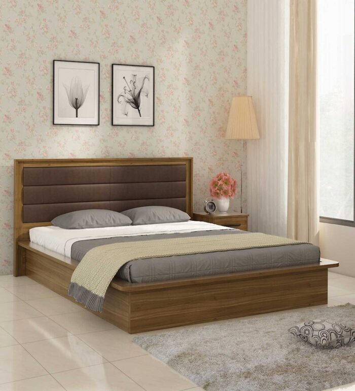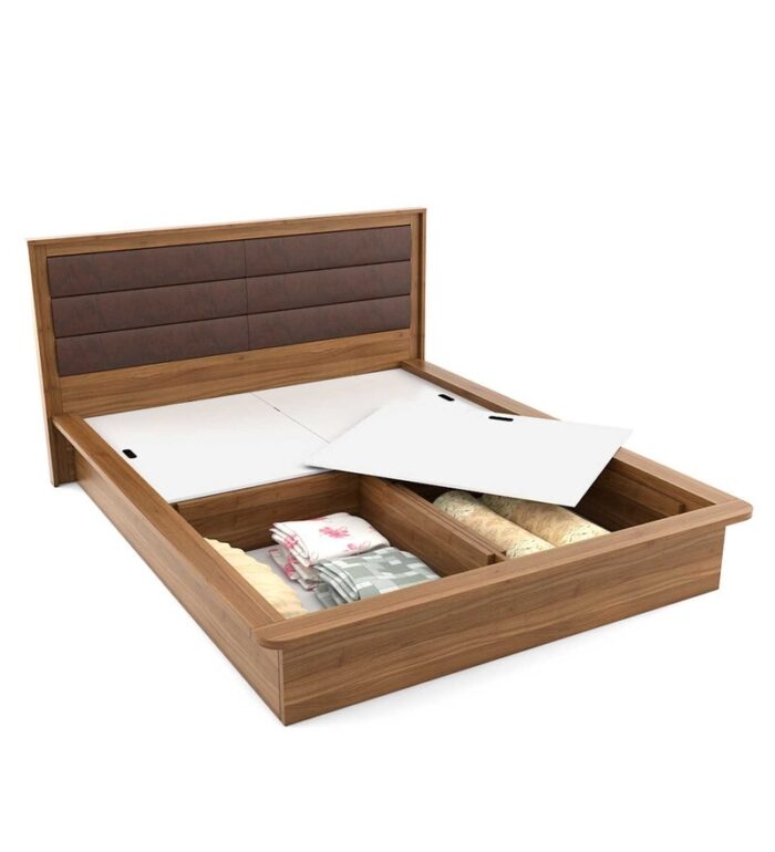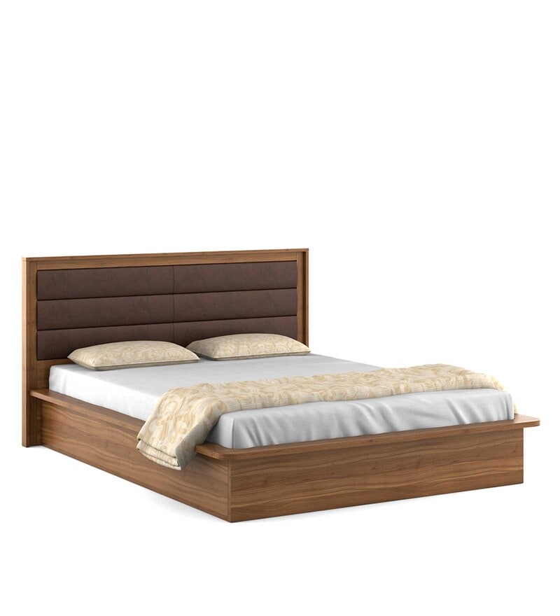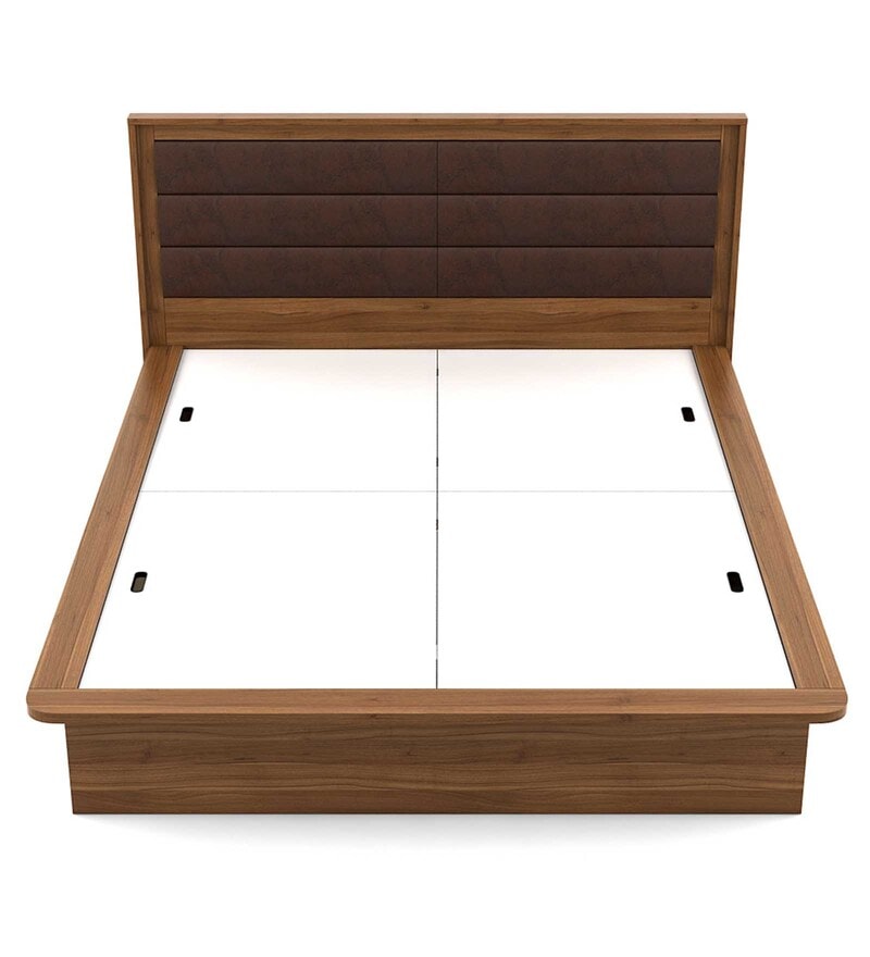 Kosmo Cooper Queen Size Upholstered Bed With Box Storage in Natural Teak Finish