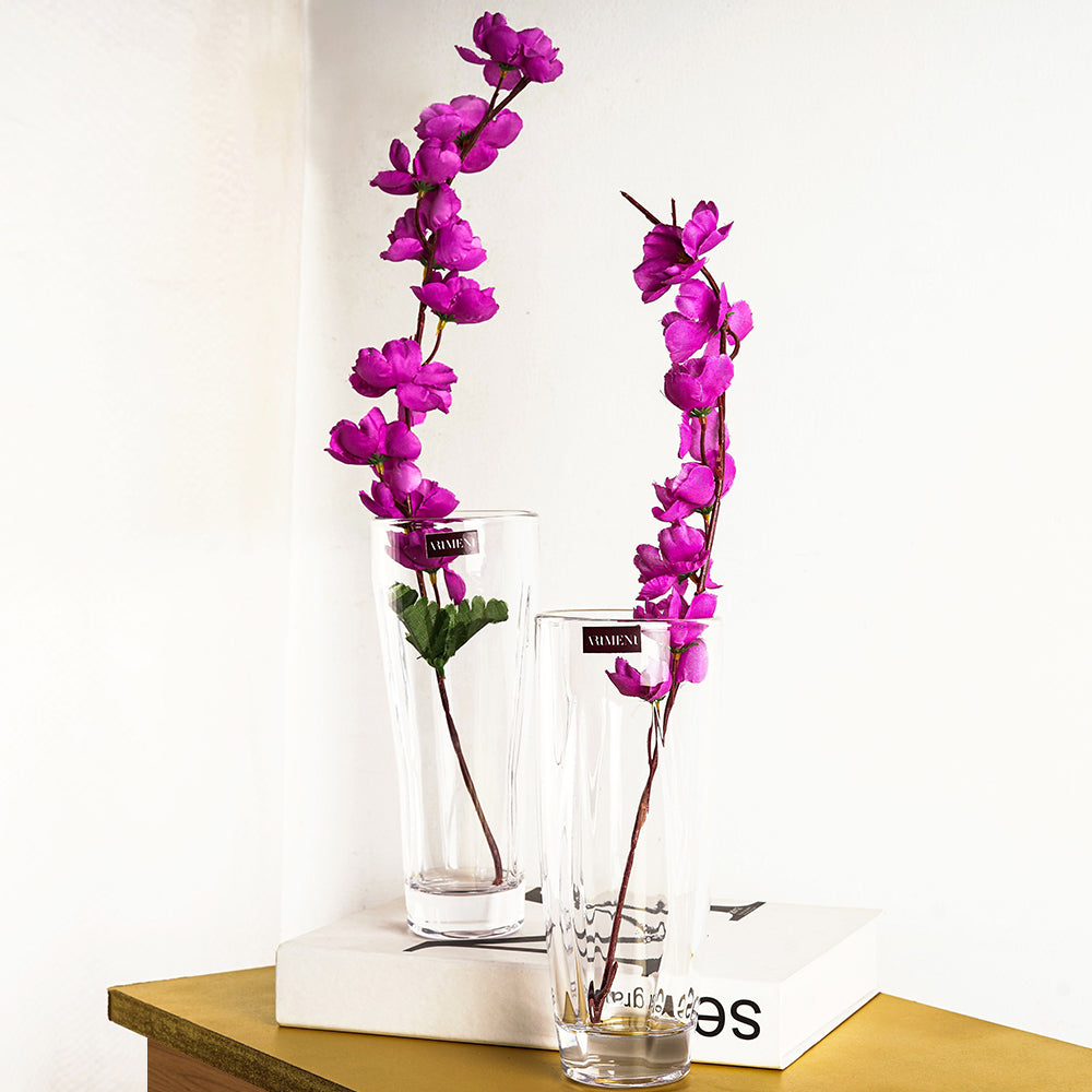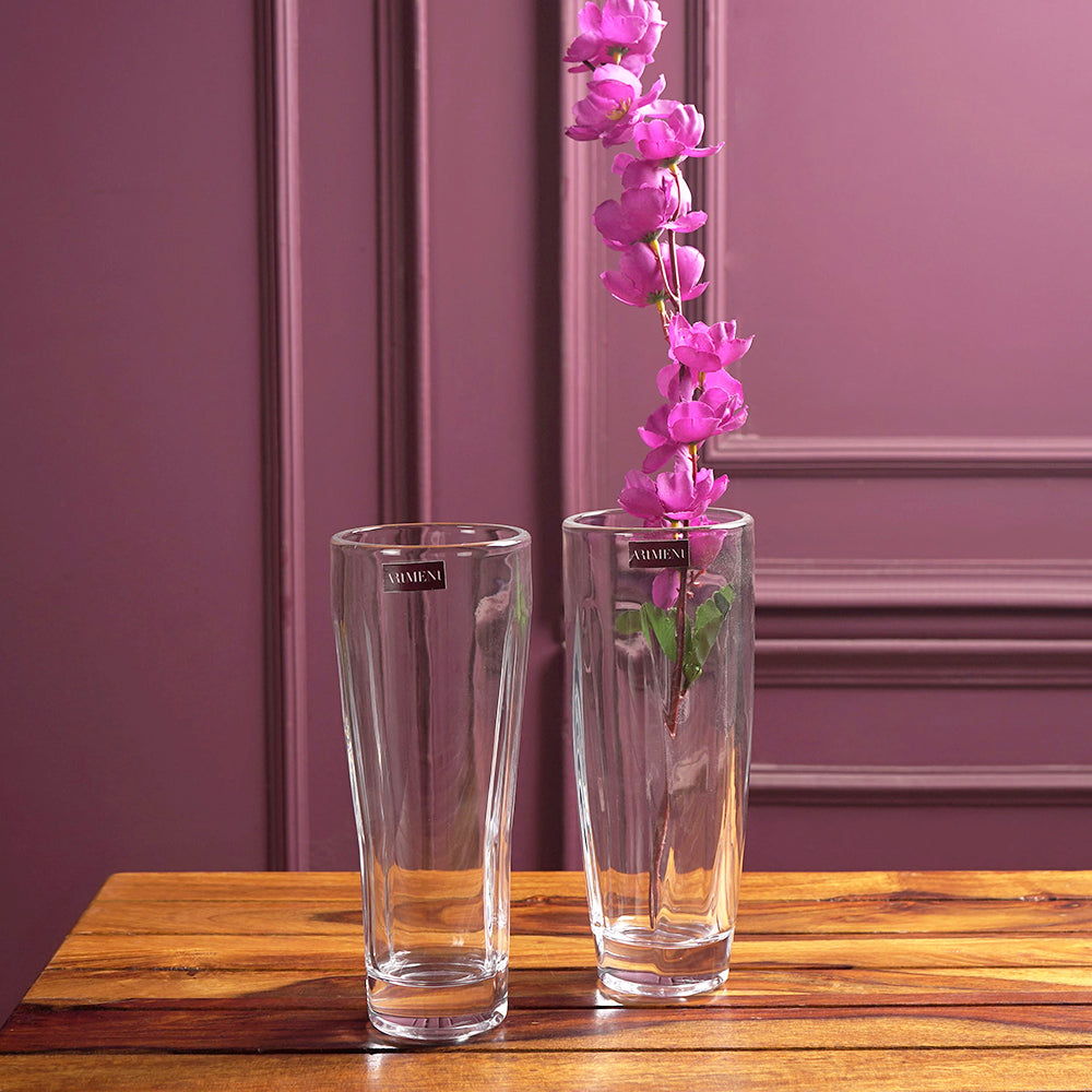 After every use, wash it with normal tap water, and clean it dry with a cotton cloth. Do not use it in a dishwasher.Handcrafted by Indian craftsmen, this glass vase is simple and delicate and lets the flowers in them shine, while taking a backseat. This glass vase set of 2 measures 8 inches by 3.2 inches. It has a 1 inch thick base, that prevents any seepage or slippage.The vases are sent individually wrapped triple layering of bubble wrap and safely packed in a box.These glass vases can be used to decorate your home, offices, or cafes. It is also ideal for gifting.The Minimal See-Through Flower Vase is part of our minimalism collection. They are made of the finest glass, handcrafted by Indian glassmiths. Slender, subtle, and sleek, this vase pair will be the ideal accompaniment for vibrant flowers. These gorgeously shaped vases can easily hold long-stemmed flowers.
