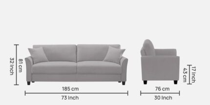 Specification GeneralFrame- Pine Wood/9mm plyUpholstery-Polyester FabricSeat Foam- 32&26DBack Cushion-Racron Polyester Fabric fiberSeat- Elastic Belt-70mm & Zig zag springLegs-White ash wood with walnut polish.Throw cushion-2 nos.