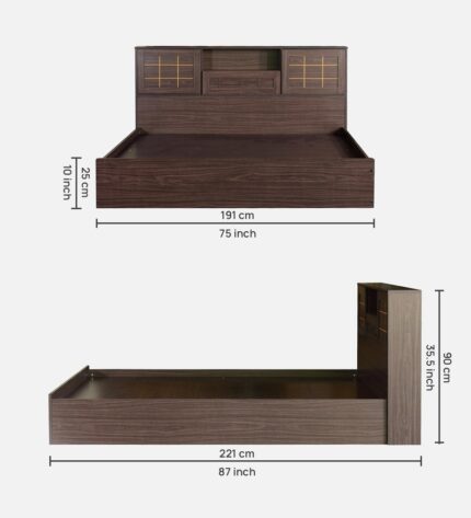 BrandA GLOBIA CREATIONSDimensions(In Inches)H 39.4 x W 61.6 x D 80.7Weight120 KGWarranty12 Months’ WarrantyAssemblyCarpenter AssemblyPrimary MaterialEngineered WoodRoom TypeBedroomStorageBox StorageSeating Height12Recommended Mattress Size78 L x 60 W InchProduct Rating5Dimensions (In Centimeters)H 100.1 x W 156.5 x D 205