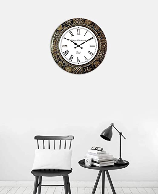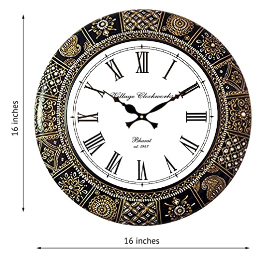 About this itemClock dimension : 16 x 16 inchesDial dimension : 10 inchesWooden frame which is designed to last long and curved glass lens makes it easy to clean and keeps dust away from dial. This Wall Clock is great for any room at home, office or classroom. The classic frame will dress up any roomās decor such as your kitchen, living room, bedroom, family room or dining room.Wall Clock with Large black bold numbers against white face creates easy viewing. This decorative wall clock has been diligently handcrafted by proficient artisans of Rajasthan using various traditional techniques.Easy to Hang on any nail, screw or small wall hook with Large black bold numbers against white face creates easy viewing and precise quartz movements to guarantee accurate time.