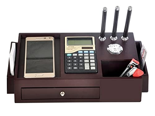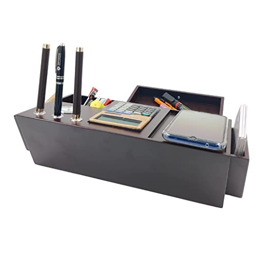 About this itemThis multi-storage wooden desk organiser helps you keep all your basic essential stationary in decent order to keep your desk clutter freeMade from 100% Pure MDF Wood, Well Polished Glossy Coats for Enhanced Beauty, Quality AssuredProfessional looking organizer ā Polished MDF wood gives this pen stand a great appeal, while the black edges give it a very attractive contrastAccessorises Included: Calculator, Clock, Non-Sticky Notes and 4 CoastersMultiple Quality Checks for Amazon Buyers during Manufacturing.